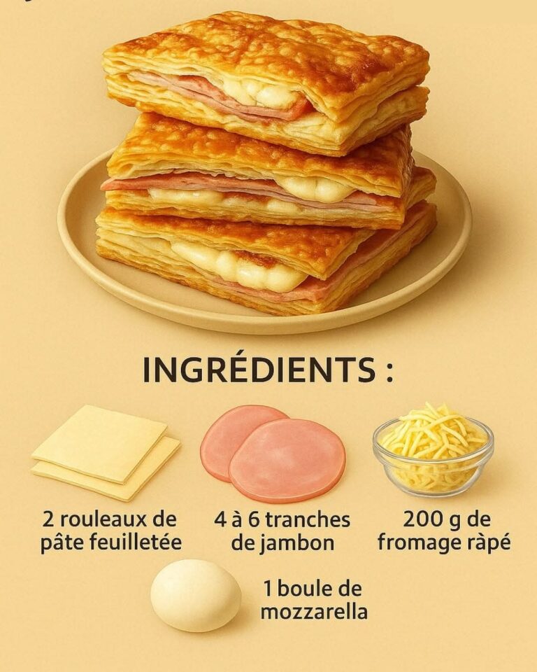 Ce feuilleté au jambon et fromage est bien plus qu’une recette express — c’est un concentré de réconfort à partager. Que ce soit pour un repas en semaine, un apéritif dinatoire ou un moment de nostalgie culinaire, il coche toutes les cases : simplicité, gourmandise et rapidité.